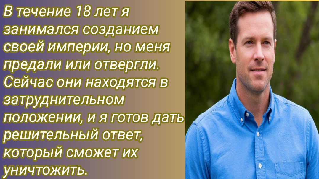 Этот рассказ описывает историю человека, который на протяжении 18 лет усердно строил свою империю. Однако в какой-то момент он столкнулся с предательством или отвергнутым отношением со стороны тех, кто был ему близок или важен. Теперь, оказавшись в трудном положении, он готов принять решительные меры, чтобы нанести им серьезный урон или полностью их уничтожить. Рассказ подчеркивает тему предательства, борьбы за власть и возможности возмездия.