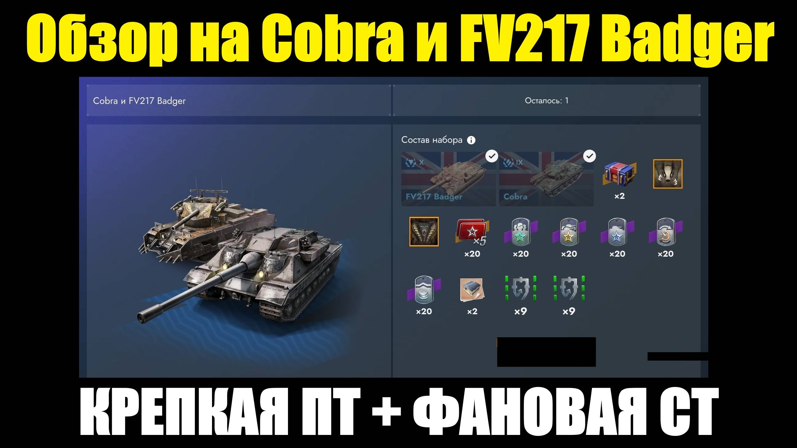 В этом видео я рассказываю о танках Cobra и FV217 Badger, которые появились в продаже за золото в игре Tanks Blitz. РОЗЫГРЫШ В ГРУППЕ В ВКОНТАКТЕ: https://vk.com/wall-221740652_4016 ПОДДЕРЖАТЬ АВТОРА: https://www.donationalerts.com/r/oneshot_play ✅TanksBlitz Обзоры танков (плейлист): https://rutube.ru/plst/445862/ ✅Мой канал ВКонтакте: https://vk.com/oneshot_play1 ✅Мой канал на YouTube: https://www.youtube.com/@OneShot_Play ✅Мой второй канал по играм: https://rutube.ru/channel/41302499/ Ставьте лайки, рассказывайте друзьям и обязательно комментируйте! =) #wotblitz#tanksblitz#вотблитц#танкблитц#обзортанка#обзор