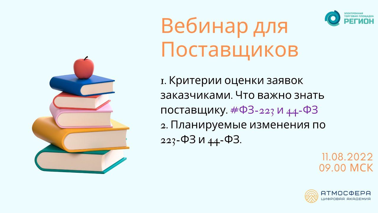 Подписывайтесь на нас в социальных сетях, чтобы не пропустить свежие новости: https://academy-atmosphere.ru/zakupki https://t.me/academy_atmosfera https://vk.com/academy_atmosfera https://rutube.ru/channel/24606397/ 00:00 Вступление 01:21 Приветствие спикера Султанову Лилию Файласовну 01:48 ПЛАНИРУЕМЫЕ ИЗМЕНЕНИЯ в ФЗ 223 И 44-ФЗ 02:31 Программы развития поставщиков из числа МСП для их участия в закупках по 223-ФЗ (с 12.11.2022) 09:41 Типовая форма независимой гарантии 13:54 Изменения в 44-ФЗ с 01.10.2022 25:13 Изменения в 44-ФЗ с 01.01.2023 40:20 Изменения в 44-ФЗ с 01.07.2023 41:37 Вопросы от участников 54:00 Приветствие спикера Цакоева Хетага Валерьевича 54:30 Прядок оценки заявок и ошибки 57:05 Проблематика 01:00:20 Формирование лота 01:02:03 Оценка заявок 01:07:28 Анонс вебинаров на август 01:55:43 104-ФЗ от 16.04.2022 01:58:35 109-ФЗ от 16.04.2022 01:59:00 Типовые ошибки в ПоЗ 01:59:08 Типовые ошибки при проведении закупки 01:59:53 Виды предписаний и ответственность 02:01:13 НДС и ценовое предложение 02:04:46 Информация о поступивших в ФАС жалобах 02:07:16 Вопросы от участников Анонс вебинаров на август
