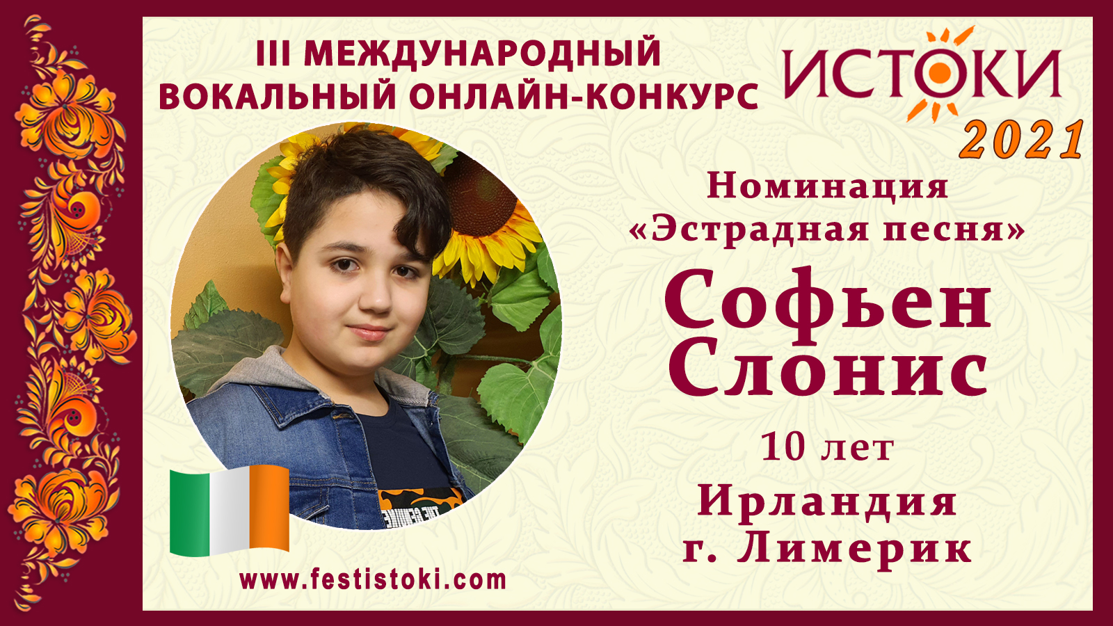 Участник III Международного вокального онлайн-конкурса «Истоки». Номинация "Эстрадная песня". Песня "Моя бабушка курит трубку". Автор Гарик Сукачев. Сайт: www.festistoki.ru / www.festistoki.com E-mail: festistoki@mail.ru