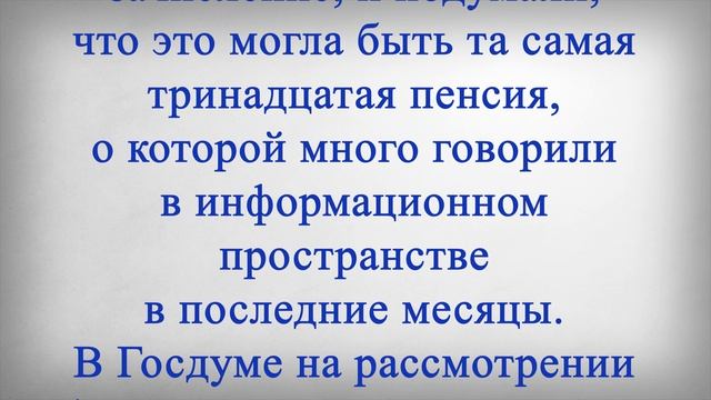 13 Пенсия Всем Пенсионерам в Январе! Российским пенсионерам рассказали всю правду о тринадцатой пенсии, которую многие ждут до сих пор, то есть до конца января. Информацию о такой выплате прокомментировали специалисты Пенсионного фонда. И эксперты поставили точку в наболевшем вопросе, который обсуждается уже несколько месяцев. О ситуации сотрудники ПФР рассказали, отвечая на многочисленные вопросы, которые поступают от пенсионеров. Дело в том, что многим пожилым гражданам в декабре уже прошлого года пришли две пенсии. Одна выплата была зачислена по привычному графику: кому-то в начале месяца, а кому-то в середине или ближе к концу, а вторая выплата поступила на банковскую карту в самых последних числах декабря, то есть двадцать восьмого или двадцать девятого декабря. При этом многие пенсионеры удивились, увидев второе зачисление, и подумали, что это могла быть та самая тринадцатая пенсия, о которой много говорили в информационном пространстве в последние месяцы. В Госдуме на рассмотрении было даже два законопроекта о такой выплате, и выдвигались эти инициативы разными партиями, имеющими вес в нижней палате парламента. Однако в ПФР прокомментировали такую информацию и заявили, что выплата, поступившая миллионам пенсионеров в конце декабря, не является тринадцатой пенсией. Более того, рассчитывать на дополнительную выплату всем пенсионерам не стоит и в январе, ведь тринадцатой пенсии на самом деле просто не существует. Как отметили специалисты, пенсия за январь была перечислена досрочно в конце декабря тем пожилым гражданам, которые привыкли получать ее на банковскую карту до 18-го числа каждого месяца. А через почтовые отделения пенсии за первый месяц нового года будут выдаваться по обычному графику начиная с 3 января. При этом следующая выплата пенсионерам поступит уже только в феврале, и это будет стандартная пенсия за февраль, но никак не бонусная. А если пенсионер еще не получал свою пенсию за январь на банковскую карту, такая выплата будет ему перечислена с 20 по 25 января. Ставьте лайк если считаете, что пенсионерам очень нужна тринадцатая пенсия и законопроекты о тринадцатой пенсии необходимо принимать и делать всем пенсионерам такую пенсию в январе.