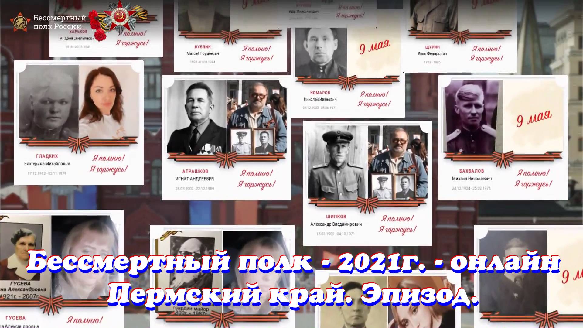 В 2020 и 2021 годах марши Бессмертного полка прошли в онлайн-формате из-за эпидемической ситуации. Каждый мог загрузить фото родственника-ветерана и сведения о нём на специальных сайтах. В 2020 г. поступило около 2,7 млн заявок. Число участников онлайн-шествия-2021 составило порядка 5 млн. Здесь представлен только небольшой эпизод онлайн марша по Пермскому краю. Общая продолжительность марша только по Пермскому краю 6 часов 47 минут и около 33500 участников. Вглядитесь в лица ветеранов на старых фотографиях : они все такие разные и все такие родные. При просмотре у меня возникает ассоциация со СВЯТЫМИ - героями, защитившими нашу страну и весь мир. А тем, кому повезло остаться живыми пришлось еще и восстанавливать разрушенную войной страну. Вечная память и уважение ветеранам. In 2020 and 2021, the marches of the immortal regiment were held in the online format due to the Covid-19. Each participant could upload photos and information about the veterans. The number of participants in the 2020 online parade was about 2,7 million and in the 2021 online parade was about 5 million. Here you will see only small episode of Immortal Regiment - 2021 online in Perm region. The total duration of the parade in the Perm region is 6 hours 47 minutes and about 33500 participants. Look at these faces of the veterans in the old photos : they are all so different and all so native. Looking at them, I have an association with SAINTS-heroes who defended our country and the whole world. And those who were lucky to stay alive had to restore the country destroyed by the war. Eternal memory and respect for veterans.