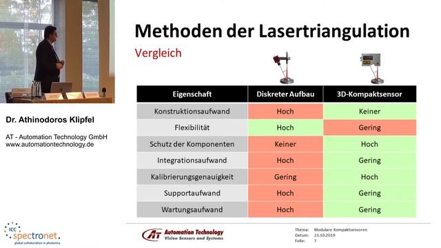 Vortrag beim Technologieforum Bildverarbeitung 8./9.10.2019 in Unterschleißheim (Deutschland) Referent: Dr. Athinodoros Klipfel, Automation Technology 3D-Sensoren mit Lasertriangulation werden immer mehr bei der Entwicklung von Inspektionssystemen in der Industrie eingesetzt. In der Regel bestehen sie entweder aus diskret aufgebauten Komponenten (Kamera und Linienlaser) oder aus seriengefertigten und werkskalibrierten Geräten mit integrierten Komponenten in einem Schutzgehäuse. Diskrete Aufbauten haben den Vorteil der einfachen Anpassung auf die Anforderungen der Applikation (FOV, Triangulationswinkel, Arbeitsabstand). Sie haben aber den Nachteil des erhöhten Aufwandes zur Systemauslegung, Kalibrierung und Integration in der Anwendung. Im Gegensatz bieten werkskalibrierte 3D-Sensoren eine einfache Integration und sie beschleunigen somit die Applikationsentwicklung. Anderseits ist eine applikationsspezifische Anpassung von seriengefertigten 3D-Sensoren nur mit hohem Aufwand und NRE-Kosten möglich. Dieser Vortrag präsentiert ein neues Konzept von 3D-Lasertriangulationssensoren mit modularem Design (MCS - Modular Compact Sensors), welches die Flexibilität von diskret aufgebauten Setups mit den Vorteilen von werkskalibrierten Geräten kombiniert. Besuchen Sie auch unsere Website: https://www.stemmer-imaging.com/de-de/