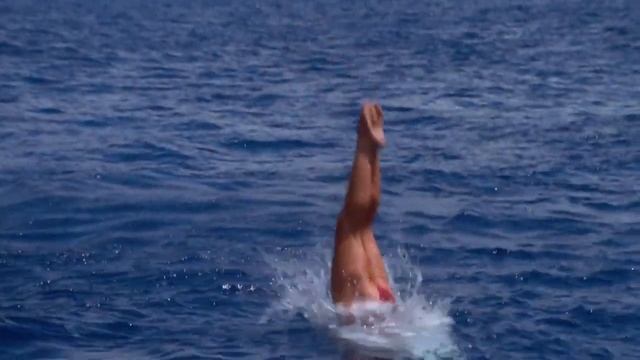 Купальщицы прыгают с кораблей в воду моря.