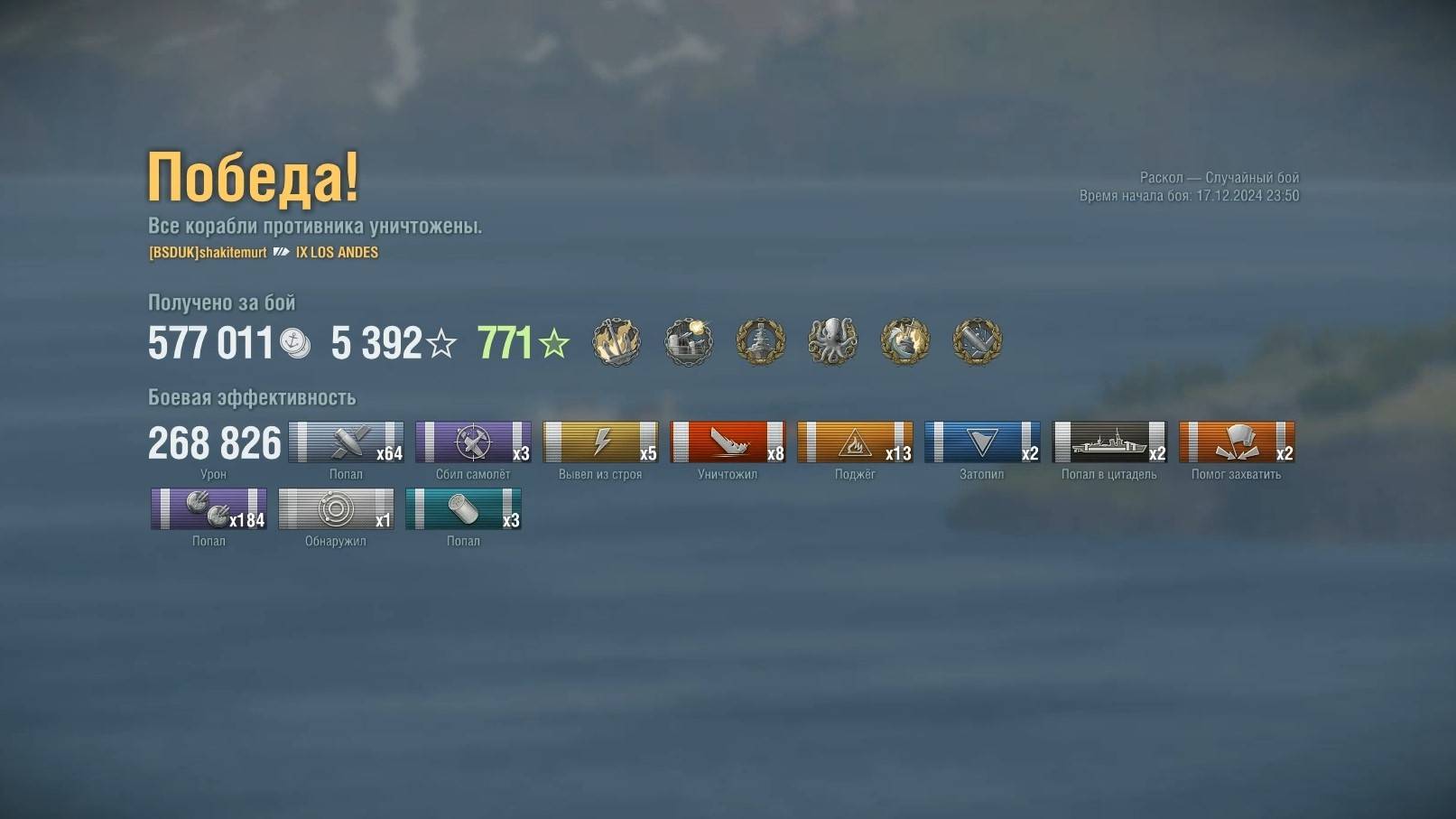 Линкор Los Andes. Игрок: shakitemurt (EU). Карта: Раскол - Случайный бой. Урон: 268к. Los Andes - Линкор Пан-Америки 9 уровня.