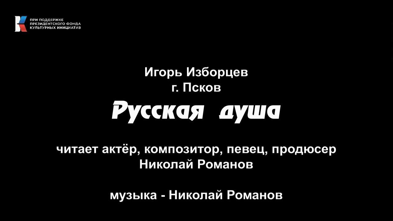 Игорь Изборцев, г. Псков, "Русская Душа", читает актёр, композитор, певец, продюсер Николай Романов. Музыка - Николай Романов --------------- Видео опубликовано на ресурсах акции "Позывной – Россия! Стихи и песни нового времени" с личного разрешения автора и не нарушает авторских и смежных прав. Положение об онлайн-акции "Позывной Россия": http://pskovpisatel.ru/?p=267388