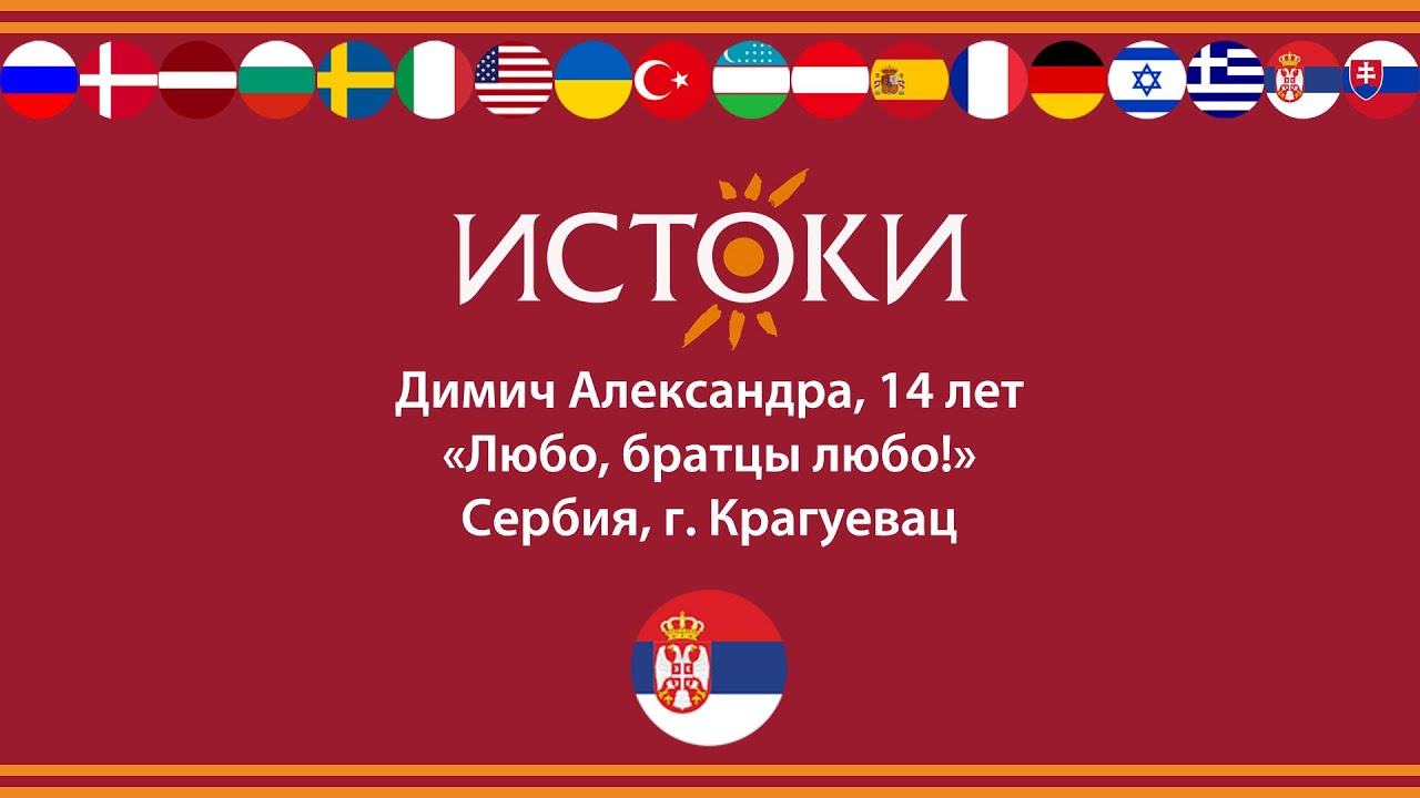 Димич Александра, 14 лет - старшая возрастная группа Сербия, город Крагуевац Песня «Любо, братцы любо!» Александра родилась в Израиле, с 5 лет поет в русскоязычном коллективе. После переезда в Сербию, занимается пением и игрой на гитаре в частной музыкальной школе под руководством гитариста из группы «Смак» Микице Милосавлевича. Фестиваль-конкурс русской культуры «Истоки» ставит своей задачей показать многообразие и красоту русской культуры, которая на протяжении многих веков формировалась за счет традиций многонациональности и добрососедства. Фестиваль-конкурс русской культуры «Истоки» - многоплановое мероприятие, которое объединяет конкурс вокалистов, обширную экскурсионную и культурную программу, концертные выступления, гала-концерт и награждение участников фестиваля-конкурса. Мы расширяем русскоязычное пространство. Благодаря поддержке Россотрудничества в фестивале принимают участие дети-соотечественники, проживающие за рубежом. Сайт: www.festistoki.ru E-mail: festistoki@mail.ru
