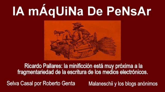 Vuelve el poeta Roberto Genta en su columna Poesía Fractal para abordar a Selva Casal. Luego oímos la intervención de Rosana Malaneschii sobre la escritura literaria bajo seudónimo en blogs, como una concepción de escritura radicalmente distinta a la del escritor tradicional. Por último oímos a Ricardo Pallares, quien desarrolla la idea de que la minificción está muy próxima a la fragmentariedad de la escritura de los medios electrónicos. En otro momento de su ponencia Pallares combate la idea de que realmente vivamos en una aldea global: según la UNESCO la mitad de la Humanidad no ha realizado en su vida una llamada telefónica y nunca lo hará.