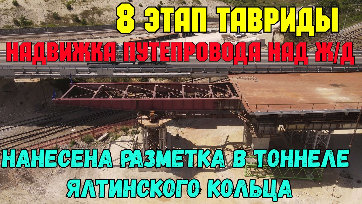 Крым.8 этап Тавриды.Идёт НАДВИЖКА пролётов путепровода над Ж/Д.Нанесена РАЗМЕТКА дороги в ТОННЕЛЕ
