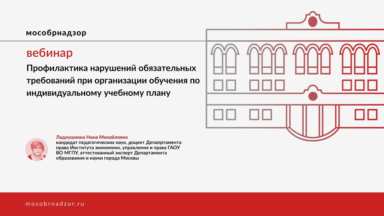 Вебинар «Профилактика нарушений обязательных требований при организации обучения по индивидуальному учебному плану» был проведен в рамках проекта Мособрнадзор.РФ 25 апреля 2023 года. Ведущая вебинара - Ладнушкина Н.М. Страница вебинара на сайте проекта - http://mosobrnadzor.ru/prevention/webinars/2023-04-25_16-00