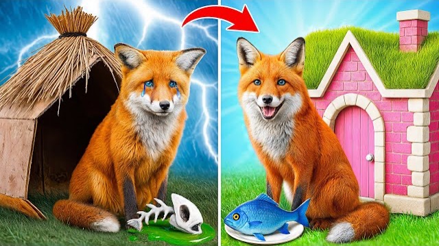 Построили домик для лисенка. Теперь он счастлив.