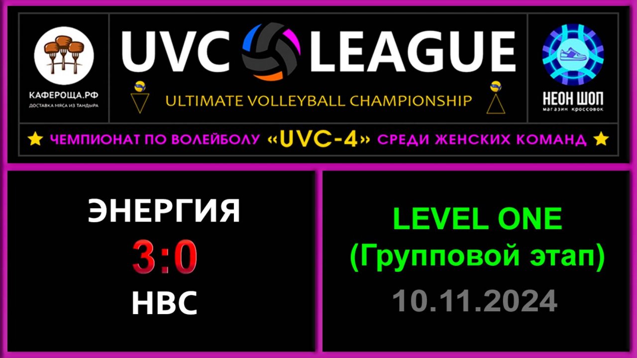 UVC-4 (Девушки): Чемпионат UVC Лиги по волейболу среди женских команд 2024-2025 гг. Результаты игры: LEVEL ONE (Групповой этап) 10.11.2024 Энергия - НВС 3:0 (25:16, 25:16, 25:21) Конкурс «РЕШАЛА»: ⛔Энергия завершила своё участие на третьем этапе! Конкурс «Робин Гуд»: ⛔Точных попаданий не было! #UVC_ЛИГА_ЧЕМПИОНАТ_UVC_4_Девушки