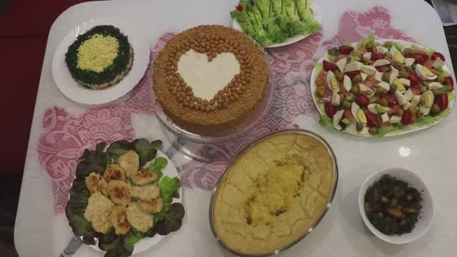 ТОРТ ВАФЕЛЬНЫЙ: - вафельные коржи – 8-9 шт. - масло сливочное – 150 г - сгущенка вареная – банка - шоколад – плитка - орехи в кокосовой глазури – по вкусу. Картофель с курицей и грибами: - картофель – 1 кг - молоко – 120 мл - масло сливочное – 30 г - соль – по вкусу - яйцо - куриное филе – 250 г - шампиньоны – 200 г - сметана – 3 ст.л - мука – 40 г - горчица столовая – 1 ч.л - сыр – 70 г - масло – для жарки Куриные котлеты: - куриная грудка – 500 г - соль - яйцо - сухой чеснок – по вкусу - масло – для жарки. Закуска из грибов: - шампиньоны – 500 г - чеснок – 2 зубчика - половинка лимона - растительное масло – 30 г - соевый соус – 40 г. Закуска в листьях салата: - листья салата - красная рыба - 2 яйца - майонез – 1,5 ст.л - сыр – 40 г. Салат с красной рыбой без майонеза: - салат Айсберг – 1 шт. - листья салата – по вкусу - красная рыба – 180 г - яйца – 3-4 шт. - помидор – 3-4 шт. - оливки без косточек – банка - сыр моцарелла – 100 г - сок лимона – 1,5 ч.л - горчица – 1 ч.л - масло растит – 40 г - соль – 1 ч.л - сахар – 1 ч.л. Салат с копченой ножкой: - копченый корок – 1 шт. - сыр – 100 г - помидор – 2-3 шт. - яйца – 3 шт. - майонез – 2 ст.л - укроп.