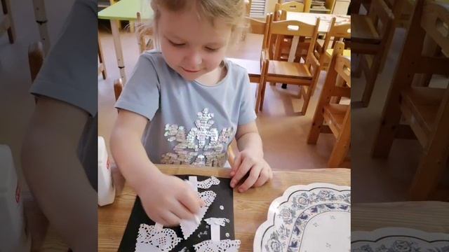 276 В гр. №12 "Капитошка" прошло занятие аппликация "Зимние ёлочки" Цель: Создать праздничное настроение, передать в аппликации образ новогодней ёлки. Задачи: Учить создавать композицию из готовых деталей. Учить составлять изображение из частей