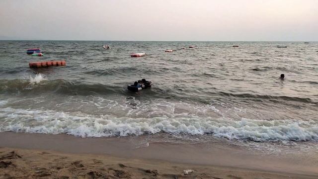 просто цвет заката - жёлто-розовый. берег, пальмы, волны