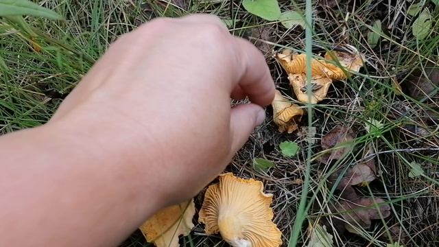 Грибы Лисички (Cantharellus cibarius) в лесу Подмосковья в июне 2023.
