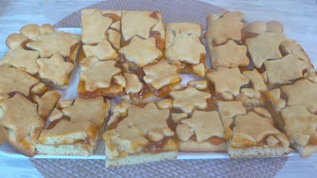 Рецепт : Мука 600 грамм + 50 грамм Масло сливочное 1 пачка (180 грамм) Сметана 3 ст л Яйцо 2 шт Сахар 230 грамм Ванильный сахар 1 пачка, 12 грамм Разрыхлитель 1 пачка (10 грамм) Соль Джем или густое повидло 0,5 банка Выпекаем при 180 градусов, 30 минут.