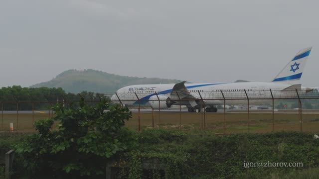 31 января 2023 года, аэропорт Пхукет (HKT/VTSP), Тайланд. Boeing 787-9 Dreamliner 4X-EDK авиакомпании El Al Israel Airlines выруливает на исполнительный ВПП 09 перед вылетом. Самолёту 6 лет, первый полёт 8 июня 2019. В составе флота El Al Israel Airlines с 18 июня 2019 года. Носит имя курортного города Эйлат (Eilat / אילת). Компоновка салона - 32 места бизнес-класса, 35 мест класса эконом-премиум, 204 места эконом-класса. * Dreamliner Boeing 787 of El Al taxiing before departure, Phuket PHUKET, THAILAND - JANUARY 31, 2023: Boeing 787 Dreamliner of El Al taxiing on the runway at Phuket Airport, before departure. El Al airline Israel. Tourism and travel concept #ElAl,#IsraelAirlines,#Dreamliner,#Boeing787,#4XEDK #spotting,#Phuket,#MaiKhaoBeach,#споттинг,#Пхукет