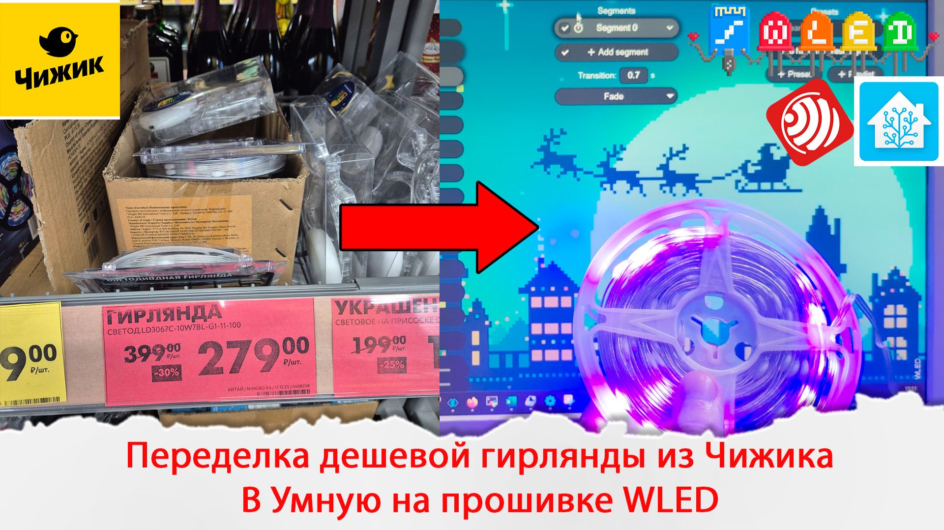 Гирлянду можно найти в магазине Чижик, но не во всех магазинах есть в наличии, по этому лучше наличие посмотреть по сайту. Для переделки я использовал микроконтроллер esp01 основанный на esp8266: https://ali.click/eywcu5?erid=2SDnjeK6oxL Но по сути подойдёт любая плата на esp8266 или esp32, просто esp01 маленькая и влезла в корпус. Еще для ESP01 нужна понижайка напряжения с 5 вольт на 3.3 вольта https://ali.click/ofycug?erid=2SDnjcC5BVS, так как она питается от этого напряжения, а в usb 5 вольт. В статье все шаги описал у себя на сайте по переделке: https://psenyukov.ru/%d0%bf%d0%b5%d1%80%d0%b5%d0%b4%d0%b5%d0%bb%d0%ba%d0%b0-%d0%b4%d0%b5%d1%88%d1%91%d0%b2%d0%be%d0%b9-%d0%b3%d0%b8%d1%80%d0%bb%d1%8f%d0%bd%d0%b4%d1%8b-%d0%b8%d0%b7-%d1%87%d0%b8%d0%b6%d0%b8%d0%ba%d0%b0/ В этом видео переделал дешевую гирлянду на адресных светодиодах из чижика размером 10 метров и имеющая 100 светодиодов. Сама гирлянда изначально уже идёт с USB контроллером работающим по Bluetooth и со смартфона ей можно управлять. Но если убрать контроллер заводской и впаять туда esp01, то получим гирлянду с гораздо большим количеством эффектов и локальной интеграцией в Home Assistant. Подписывайтесь на мой Telegram: https://t.me/ypavla Розыгрыш Декабря: https://t.me/ypavla/10755 ================================================ Меня можно поддержать на Boosty: https://boosty.to/upavla Подписаться на телеграмм канал можно по ссылке: https://t.me/+K05yDjyd4tJmYjky или https://t.me/ypavla Если хотите приобрести spruthub: https://spruthub.ru/ То у меня есть промокод на скидку: upavla Мой 3d принтер: https://ali.click/j3fpt3?erid=2SDnjdEYrJc Крутой тепловизор Infiray p2 pro: https://alii.pub/72p14i?erid=2SDnjbvvrnP Мой лабораторный блок питания Miniware: https://alii.pub/7336r4?erid=2SDnjbyopVZ Теги: #Упавла! #zigbee #homeassistant #tuya ================================================ Помощь каналу: http://www.donationalerts.ru/r/ypavla Реклама: ООО "АЛИБАБА.КОМ (РУ)" ИНН: 7703380158