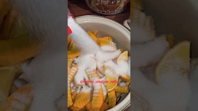 4 կգ դդում 1,6 կգ շաքարավազ 1 նարինջ կամ 🍋 1 թ.գ. կիտրոնի աղ։ Եփել 30 րոպե ընդմիջումներով 5 րոպե եփել 30 րոպե հանգստանա։