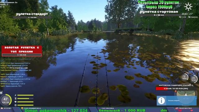 Поддержка донатом https://new.donatepay.ru/@1032463 Альтернативный донат https://www.donationalerts.com/r/kalyamba11 5536913964533059 карта Тинькоф Если стрим лагает,смотри стрим на трово https://trovo.live/s/Kalyamba_na_Ribalke Мой ВК - https://vk.com/kalyantv НИК в игре kalyan11 НАШ ДИСКОРД СЕРВЕР https://discord.gg/4ZzSQkQtsK Заказ водоема на 1 час - 500р ( весь стрим 2500р ) Модерка на канале 1200р ( каждая следующая на 100р больше) Озвучка доната на 40р,50р,100р,200р,300р,500р,1000р ✅Призы в рулетке "ЗОЛОТАЯ" ✔ ЗОЛОТО ✔ ПРЕМ ✔ КАТУШКИ РАПТОР 40, АЗИМУТ 10000, СИЛЬВЕР 80, ТАЙГА с 30 ✔ ПАЛКИ ПИЛКЕРНАЯ, ДОНКА МОРСКИЕ, ✔ РОД ПОД, СТУЛЬЯ ✅Призы в рулетке СТАНДАРТ : ✔ катушка "РАПТОР 40" ✔ катушка "АЗИМУТ 10000" ✔ катушка "ТАЙГА С30, С40," ✔ катушки 60 для медного ( ЭВИИ, НАТОРЫ, ГОЛДА, и тд) ✔ ПИЛКЕРНОЕ УДИЛИЩЕ КОРОЛЕВА ОКЕАНА ✔ Морское Донное удилище ✔ прем ( 3, 7, 30 дней) ✔ золото ( 1, 3, 5, 10, 20 ,50) ✔ билет на море ( 1, 3, 5 дней) ✔ голд наживка и др. ✅Призы в рулетке "СТАРТОВАЯ" ✔ катушка "silver80" ✔ катушка "БЕЛЫЙ КАЛИБР" ✔ катушка "Черный калибр" ✔ катушка "Протон" ✔ катушка "Нарга 6000" ✔ Набор Фидерист и спинингист ✔ Карповик Фортуна ✔ фидерные удилища ✔ прем, золото, алкашка, наживки и тд P.s Рулетка это не казино, а награда за поддержку стримера. Вечный ТОП ПОДДЕРЖКИ (11.05.2024) 1. Dimon_pokemonchik 119 784 2. Interceptor 75 508 3. Skreb79 71 261 4. une personne 68 619 5. Нарвал77 31 550