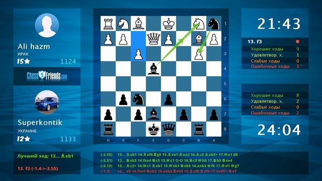 Данное видео было создано мобильным приложением ChessFriends.com **** Понравилось видео? Вы тоже можете создавать такие видео! Просто установите наше приложение, играйте и экспортируйте игры прямо в YouTube. Android: https://play.google.com/store/apps/details?id=chessfriends.online.chess iOS: https://itunes.apple.com/app/chess-online-+/id903978215?mt=8 Windows 8/10: http://apps.microsoft.com/windows/app/ajedrez-online/362ae1c9-5d6f-4824-a9e7-1095b2a95e10 OSX: https://itunes.apple.com/app/chess-online-+/id919607238?l=en&mt=12 Мобильный сайт: http://www.chessfriends.com/mobile?lang=ru_RU Facebook App: https://apps.facebook.com/chessfriendscom Windows Phone: http://apps.microsoft.com/windows/app/ajedrez-online/362ae1c9-5d6f-4824-a9e7-1095b2a95e10 **** Chess Age: Android: https://play.google.com/store/apps/details?id=chess.friends.game.play IOS: https://itunes.apple.com/us/app/chess-age/id1217007613?mt=8 Facebook: https://apps.facebook.com/chessage **** Подпишитесь на ChessFriends.com в YouTube: https://www.youtube.com/subscription_center?add_user=ChessFriendsDotCom Facebook: https://www.facebook.com/ChessFriendscom-127961610576613/?fref=ts **** Игра в формате PGN: [Event "free game"] [Site "www.chessfriends.com"] [Date "2023/5/24"] [Round "none"] [White "Ali hazm"] [Black "Superkontik"] [Result "0-1"] [ECO "A00"] [Opening "Van't Kruijs Opening"] [WhiteElo "1124"] [BlackElo "1133"] [WhiteCountry "IQ"] [BlackCountry "UA"] [TimeControl "1500000"] 1. e3 e5 2. Qh5 Nf6 3. Qxe5+ Be7 4. Qg3 g6 5. b3 Nc6 6. Bb2 Nb4 7. Kd1 d6 8. Qf3 Bf5 9. Qxb7 Rb8 10. Qf3 Nxc2 11. e4 Bxe4 12. Qe2 Nxa1 13. f3 Bxb1 14. Bxa1 Bxa2 15. Bxf6 Bxb3+ 16. Ke1 Kd7 17. Bxh8 Qxh8 18. g3 Qd4 19. Bh3+ Kd8 20. Qf2 Qa1+ 21. Ke2 Bc4+ 22. d3 Rb2+ 23. Ke3 Qc1+ 0-1