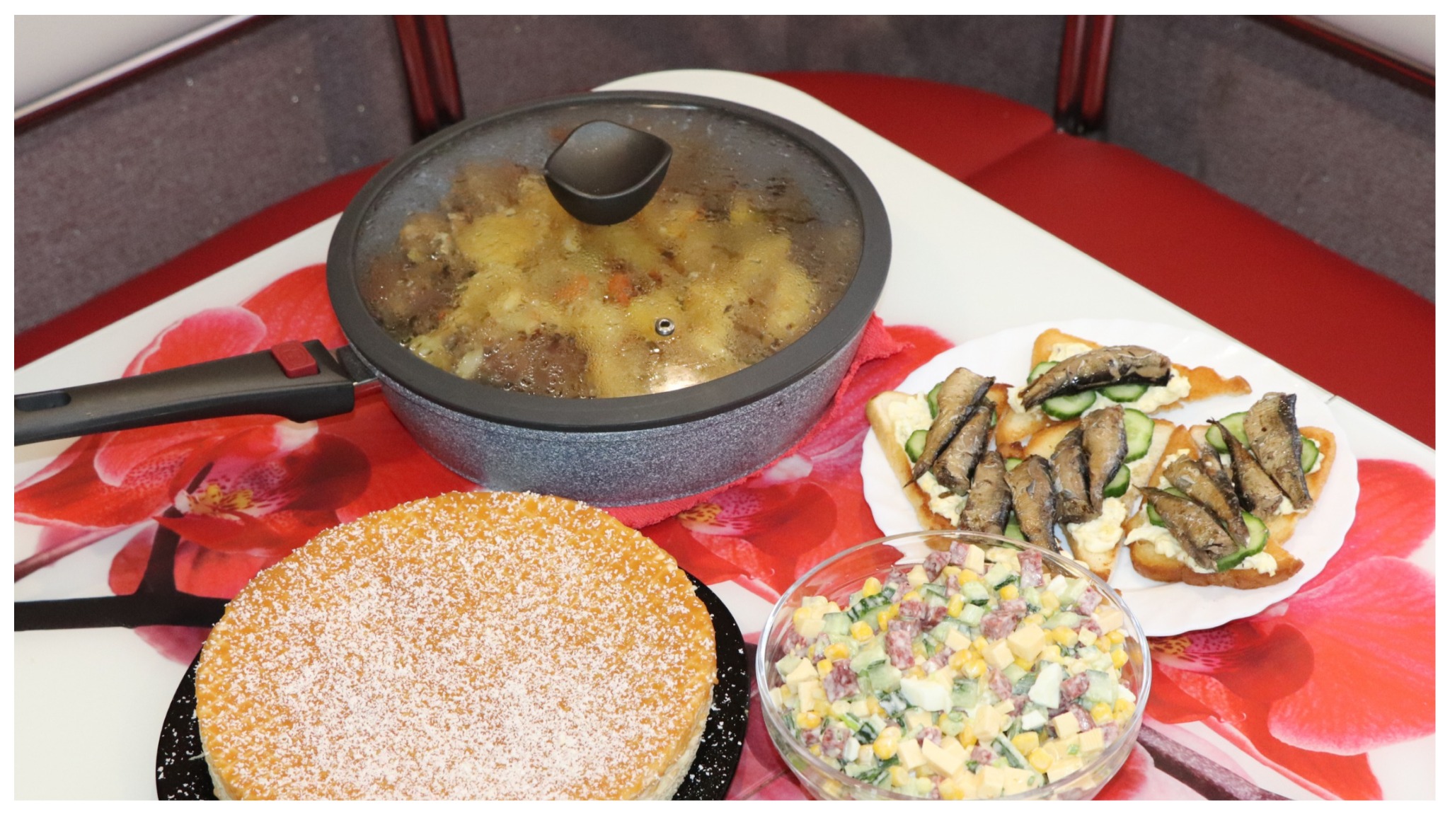 Картофель со свиными ребрышками: - картофель – 1 кг - ребра свиные – 800 г - морковь – 1 кг - масло – для жарки - стрелки чеснока – 10 г - соль, специи. Торт из вафельных коржей: - коржи вафельные - масло сливочное – 50 г - вареная сгущенка – банка - шоколад белый – для обсыпки. Бутерброды со шпротами: - хлеб белый – 1 шт. - шпроты – банка - масло растит – для жарки - яйца – 2 шт. - майонез – 2 ст.л - огурец – 1 шт. - чесночная заправка – 10 г. Салат: - яйца – 2 шт. - колбаса копченая – 100 г - сыр – 100 г - огурец – 1 шт. - зеленый лук – пучок - кукуруза – банка - майонез – для заправки.