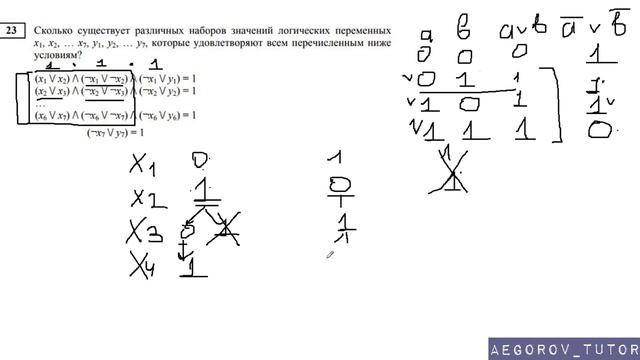 https://www.egoroffartem.ru/ege/task/23 На сайте размещены другие задания по этой теме https://www.egoroffartem.ru/ege/videotask/23 Список всех разборов 23 задания из ЕГЭ по информатике: https://www.egoroffartem.ru/ege/videotask/ Видео решения задач по ЕГЭ информатике https://vk.com/egoroff_channel В данном группе можете найти информацию о новых видео и задать вопросы по ЕГЭ Информатике Полная статья о решении 23 задания: https://vk.com/@aegorov_tutor-kak-spravitsya-s-23-zadaniem-iz-ege-po-informatike Разбор задания № 23 из досрочного варианта 2018 ЕГЭ Информатика Тема задачи "Система логических уравнений" В данном видео рассматривается решение системы логических уравнений: (x1 ∨ x2) ∧ (¬x1 ∨ ¬x2) ∧ (¬x1 ∨ y1) = 1 (x2 ∨ x3) ∧ (¬x2 ∨ ¬x3) ∧ (¬x2 ∨ y2) = 1 ..... (x6 ∨ x7) ∧ (¬x6 ∨ ¬x7) ∧ (¬x6 ∨ y6) = 1 (¬x7 ∨ y7) = 1