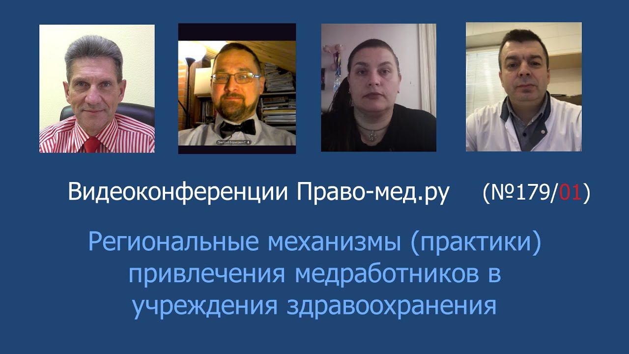 Видеоконференция Право-мед.ру № 179 (01) от 27 января 2022 года на которой обсуждались инициативы регионов по привлечению и меры по удержанию медицинских работников в целях преодоления кадрового дефицита Рассмотренный вопрос 1.Прогноз применения региональных практик для снижения дефицита медработников первичного звена Тайминг Панов А.В., вступление 01:39-05:50 Гаганов Д.Б. 06:15-12:30 Панов А.В. 13:22-15:11 Стешенко А.И. 15:41-18:42 Севастьянова Ю.В. 18:48-23:36 Участники: Панов Алексей Валентинович, главный редактор информационного портала Право-мед.ру, г. Омск , член АЮР Гаганов Дмитрий Борисович, юрисконсульт Ассоциации организаторов здравоохранения в онкологии г. Санкт-Петербург Стешенко Андрей Иванович, сторонник партии "Новые люди", представитель комитета партии «По охране жизни и здоровья», военный врач, организатор здравоохранения, г. Москва Севастьянова Юлия Владимировна, медицинский юрист, ВОЛГГМУ, г. Волгоград