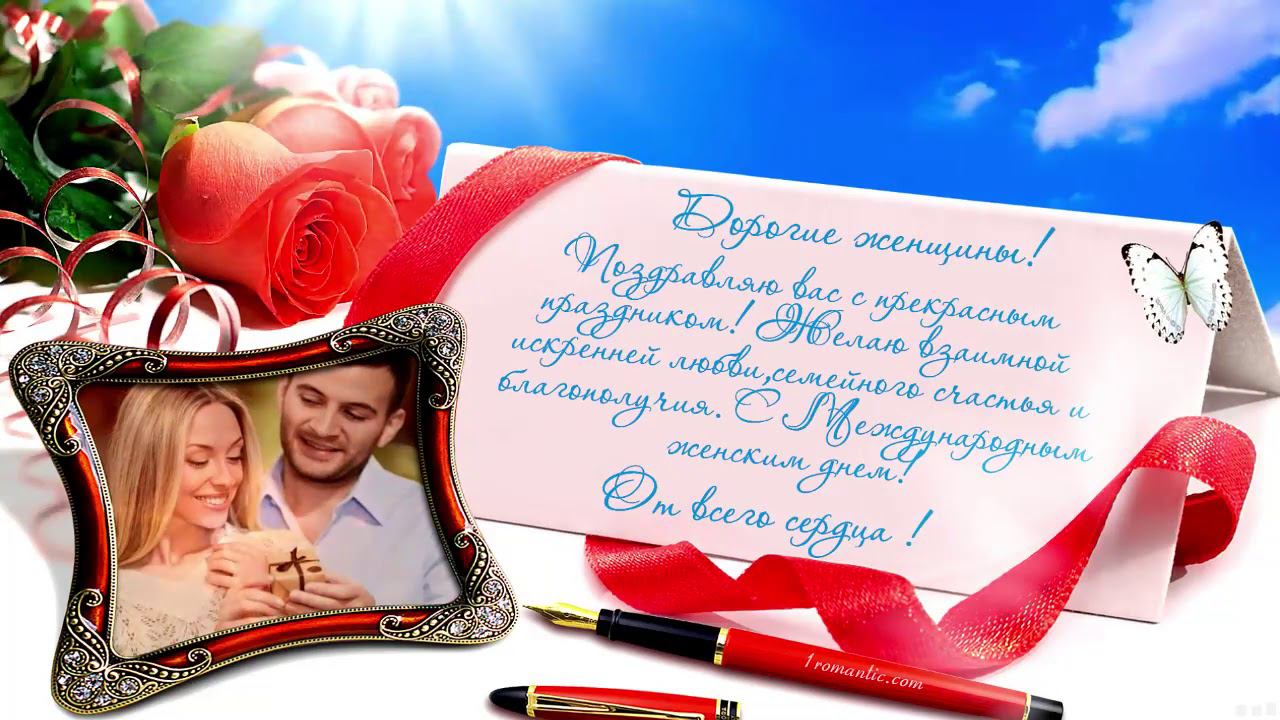 С НАСТУПАЮЩИМ ПРАЗДНИКОМ, ДОРОГИЕ НАШИ ЖЕНЩИНЫ! Пусть этот день, 8 Марта, подарит вам прекрасное настроение, исполнение всех сокровенных желаний! Пусть он станет стартом для новых начинаний, которые принесут только радость! Искренних вам комплиментов и добрых слов всегда! Желаю сказочного настроения, ласковых мужских объятий, головокружительной карьеры, любимых увлечений, семейной стабильности, ярких впечатлений, финансовой независимости, счастливых улыбок и много-много таких волшебных дней . https://1romantic.com/golosovye-pozdravleniya-po-telefonu/ ЗАПОЛНИТЬ ЭТО ПОЗДРАВЛЕНИЕ СВОИМИ СЛОВАМИ (установите нужную дату и время доставки для своего получателя) : Здесь ➞ https://1romantic.com/ Вам остаётся только, написать нужный вам текст и загрузить фото, свою или Вашего получателя. 1Romantic.com Является первым и единственным в мире сервисом интерактивных видео поздравлений.