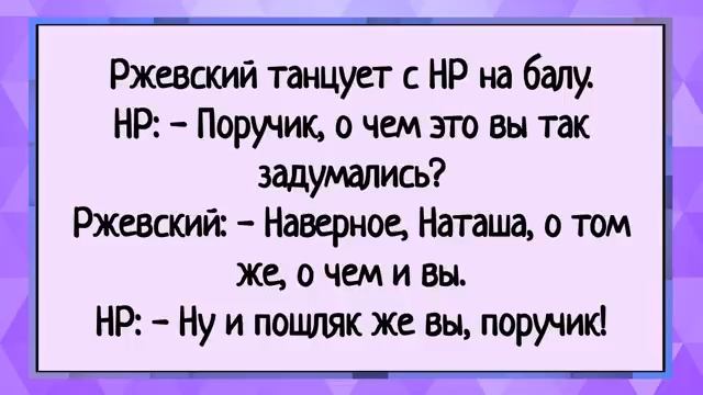 Как тёща и зять в дурака на желания играли! Сборник свежих анекдотов! Юмор! 00:05 Удаление зуба во время беременности • Блондинка на восьмом месяце беременности беспокоится об удалении зуба. • Другая блондинка рассказывает, что у её знакомой ребёнок родился без зубов после удаления зуба во время беременности. 00:32 Парашют и сержант • Сержант обещает заменить парашют, если он не раскроется. 00:42 Предложение руки и сердца • Мужчина заявляет о своей любви к дочери и предлагает жениться на любой из трёх. 00:56 Суд и профессия • Судья спрашивает подсудимого о его профессии, на что тот отвечает: «Окробот». 01:08 Разговор о знакомстве • Ржевский объясняет, что кровать не повод для знакомства. 01:19 Артиллерийский вопрос • Сержант спрашивает молодого артиллериста, что делать при перелёте снаряда. 01:33 Встреча с богатым • Девушка уходит с богатым парнем, объясняя это тем, что он её личный водитель. 02:05 Разговор гусаров об искусстве • Гусары обсуждают витражи и венецианское стекло, Ржевский шутит о трёхлитровой банке. 02:39 Тонущий корабль • Англичанин спрашивает о шлюпке для курящих, капитан отвечает, что пробоина ниже ватерлинии. 03:03 Отсутствие детей • Наташа жалуется на отсутствие детей, несмотря на брак с Пьером. 03:16 Обучение метанию гранаты • Солдат рассказывает, что сержант недолюбливает его из-за способа обучения метанию гранаты. 03:36 Футбольный матч • Капитан слонов извиняется за грубость во время матча, капитан муравьёв отвечает, что они тоже играли грубо. 03:56 Танец на балу • Ржевский танцует с Наташей Ростовой, поручик шутит о её мыслях. 04:10 Тонущий корабль и направление • Капитан спрашивает о направлении к ближайшей шлюпке, получает ответ «в вертикальном». 04:22 Концерт в Магнитогорске • Олег Митяев рассказывает о своём выступлении в техникуме, где студенты узнали его как Рэмбо.
