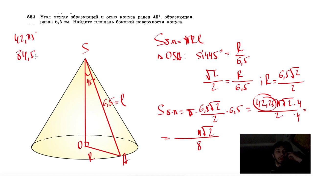 №562. Угол между образующей и осью конуса равен 45°, образующая равна 6,5 см. Найдите площадь боковой поверхности конуса. Поддержать канал рублём - 5469400944002125 (Сбербанк) Мой второй канал для подготовки к ЕГЭ и ОГЭ - https://www.youtube.com/ЕвгенийСумин Инстаграм - https://www.instagram.com/EGE_OGE.math Личный инстаграм - https://www.instagram.com/ee_sumin VK - https://vk.com/evgeniysumin FB - https://www.facebook.com/EvgeniySumin