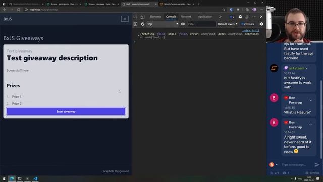 This is a livestream in "Building X with javascript" series. In this livestream I will be creating simple giveaways functionality with Next.js and Hasura. Project links: Discord: https://discord.gg/hnKCXqQ Facebook: https://www.facebook.com/buildingproductswithjs/ Reddit: https://www.reddit.com/r/BuildingWithJS/ Source code: https://github.com/BuildingXwithJS/BxJS-Website/ Social media links: Follow me on Twitter: http://twitter.com/yamalight Follow me on Medium: https://medium.com/@yamalight Follow me on Github: http://github.com/yamalight Follow me on Twitch: https://www.twitch.tv/yamalight Follow me on Facebook: https://www.facebook.com/buildingproductswithjs Support me: https://codezen.net/support.html