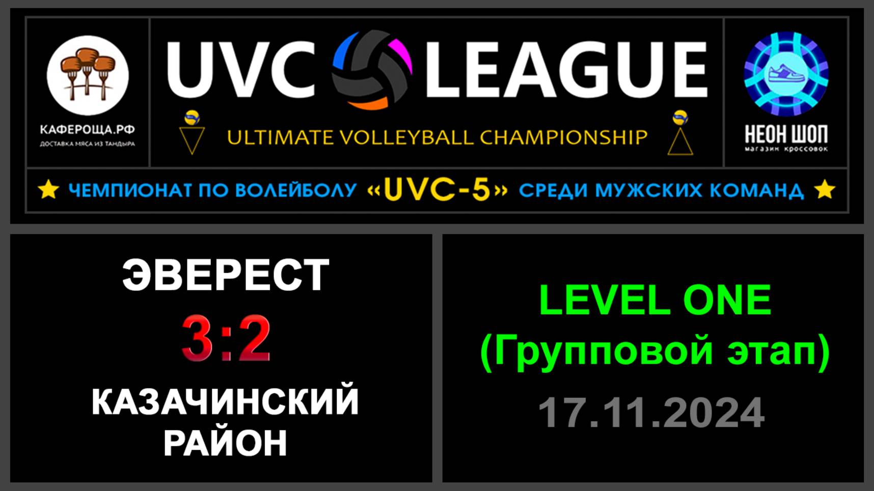 UVC-4 (Мужчины): Чемпионат UVC Лиги по волейболу среди мужских команд, 2024-2025 гг. Результаты игры: LEVEL ONE (Групповой этап) 17.11.2024 Эверест - Казачинский район 3:2 (21:25, 25:20, 25:20, 20:25, 15:9) Конкурс «РЕШАЛА»: ⛔Эверест завершил своё участие на втором этапе! ⛔Казачинский район завершил своё участие на третьем этапе! Конкурс «Робин Гуд»: ⛔Точных попаданий не было! #UVC_ЛИГА_ЧЕМПИОНАТ_UVC_5_Мужчины