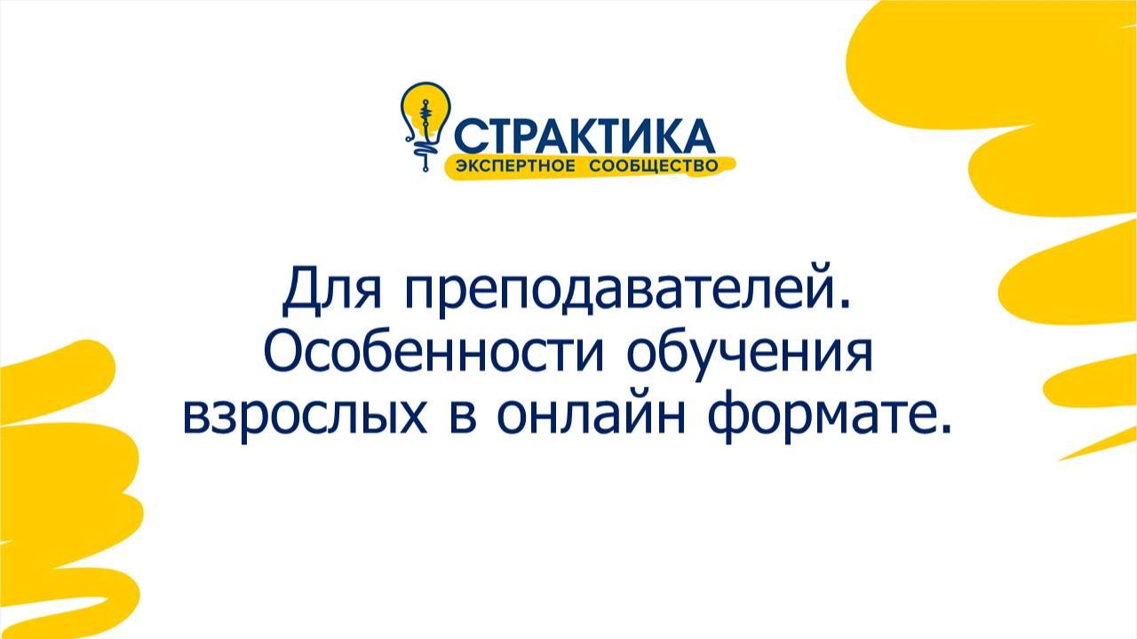 Групповая динамика обучения. Говорим про то, как и что меняется в обучении, чем обучение взрослых отличается от обучения детей, какие методы работы со взрослыми нужно использовать для вовлечения их в процесс и для повышения результативности обучения. 00:00:00 Введение и представление участников 00:05:18 Сложности онлайн-обучения 00:12:24 Особенности обучения детей и взрослых 00:18:54 Технические аспекты онлайн-обучения 00:34:00 Подготовка к обучению 00:48:43 Групповая динамика в онлайн-обучении 00:54:24 Методы интерактивного обучения 00:59:37 Организация онлайн-тренинга. Техническое сопровождение 01:03:30 Цикл Колба 01:16:39 Работа с вебинарными комнатами 01:22:03 Методы обучения 01:35:24 Оптимизация работы преподавателя 01:37:18 Завершение встречи
