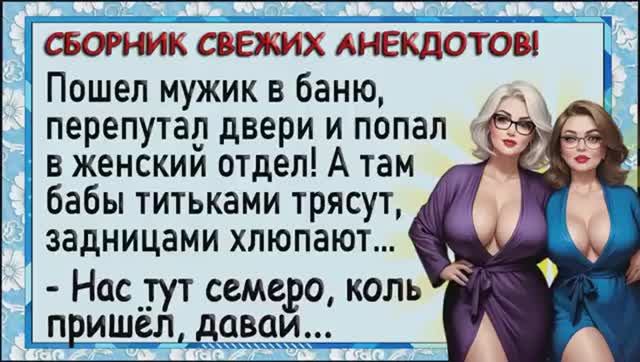 Как мужика в бане бабы заставили делать... Сборник свежих анекдотов! Юмор! 00:00:09 Подарок на день рождения • Муж и жена обсуждают, что подарить маме на день рождения. • Вспоминают, что в прошлый раз подарили стул, и решают подвести к нему электричество. 00:00:25 Утренний диалог • Люся просыпается и просит минералки. 00:00:45 Авария на дороге • Мужик на «девятке» задевает «Мерседес». • Из «Мерседеса» выходит женщина и звонит мужу, сообщая об аварии. • Муж спрашивает, какая у мужика машина, и женщина отвечает, что у него «Ягуар». 00:02:06 Стрельба из пистолета • Папа покупает сыну пистолет и разрешает стрелять в кусты. • Сын сообщает, что прострелил соседу член и маме обе щеки. 00:02:34 Страус и его желудок • Женщина говорит, что страус плохо видит, но его желудок может переварить всё. 00:02:48 Реклама антенны • Мужчина возвращается домой из-за рекламы антенны «Триколор». 00:03:07 Заявление на отпуск • Сотрудник просит подписать заявление на отпуск, но предупреждает, что может понадобиться по работе. 00:03:20 Заяц и триппер • Заяц приходит к глазному врачу, объясняя, что у него «глаза на лоб лезут». 00:03:40 Преследование на работе • Молодой парень жалуется шефу на постоянное преследование сотрудниц. • Шеф обещает награду — корыто овса. 00:04:05 Открытие блондинки • Блондинка приглашает подругу и показывает, что весь свет делся в холодильник. 00:04:39 Голый мужик в шкафу • Приятель рассказывает о голом мужике в шкафу, удивляя собеседника отсутствием жены. 00:05:17 Путь к сердцу женщины • Вопрос о пути к сердцу женщины получает неожиданный ответ: «Путь к сердцу женщины вообще не должен лежать». 00:05:40 Свидетельство о браке • Муж спрашивает о свидетельстве о браке, чтобы проверить, указан ли в нём срок гарантии. 00:05:52 Пьяный муж • Пьяный муж протягивает жене фигу, отвечая на её руган