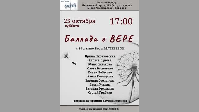 «Баллада о Вере». К 80-летию Веры Матвеевой. Ведущая - Наталья Коренева. Клуб песни «Восток». 25 октября 2025 г. Видеозапись - Алла Левитан. Запись звука - Сергей Острик. Санкт-Петербург, Московский пр., д. 189