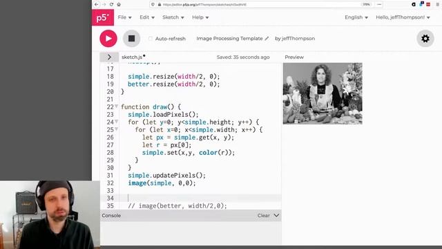 Converting an image to grayscale is perhaps the simplest of filters we can implement ourselves. While p5.js' grayscale filter is a one-line, easy option, it's useful to understand how it works, and, as you'll see below, we can also improve it a bit, too! ?? https://editor.p5js.org/jeffThompson/sketches/W4lhQnysj ALL THE VIDEOS IN THIS UNIT ? https://youtube.com/playlist?list=PLsGCUnpinsDkDT1Kr4oy5tmpd2N3LP9qJ CHALLENGES ❓ Another way to create a grayscale image is to average the values for red, green, and blue. Can you implement that below? Do you prefer those results or just the red value? ❓ This demo uses get() and set(), which can be slow with large images – can you convert this to use the pixels array instead?
