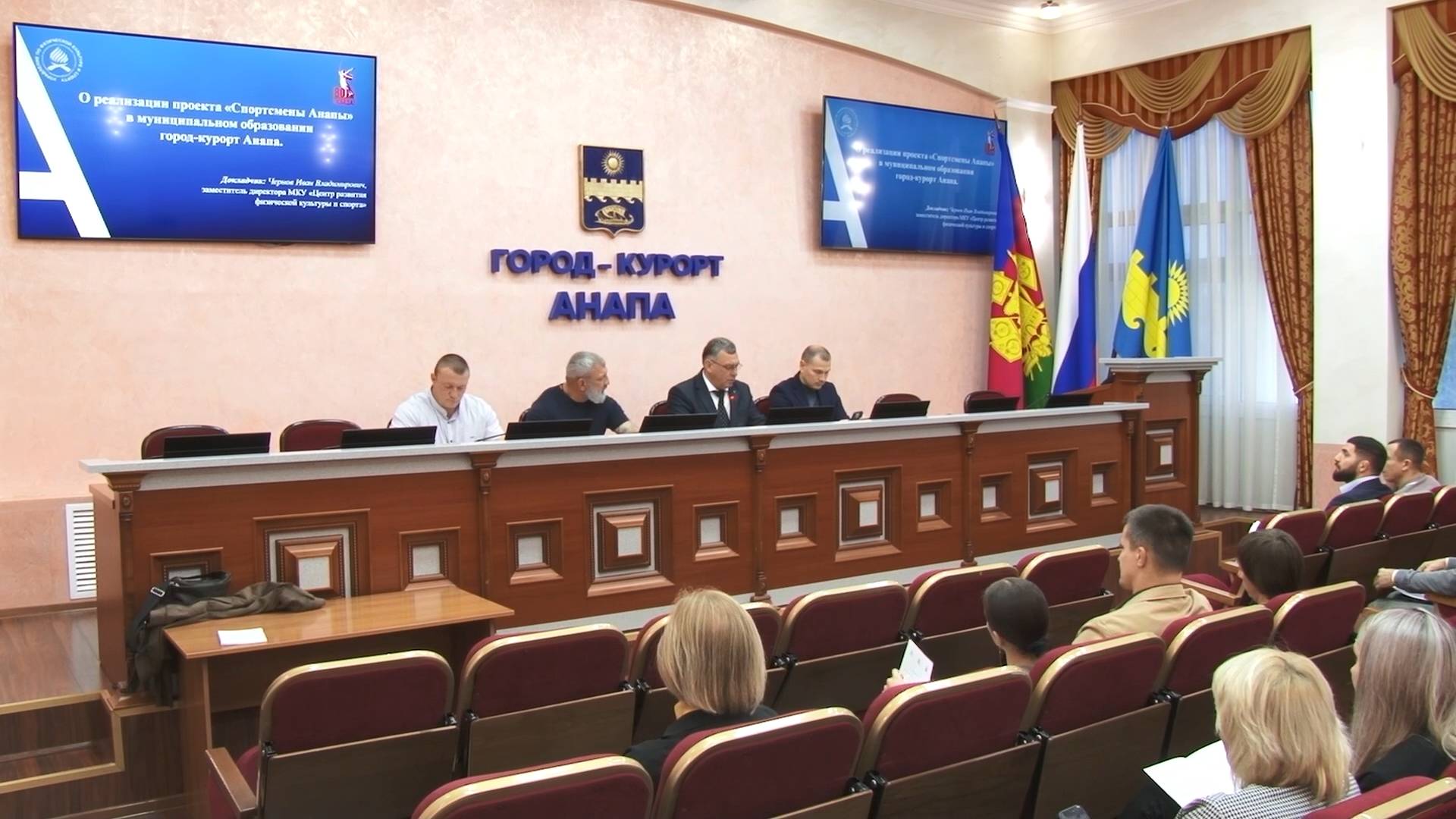 Заседание возглавил вице-мэр курорта Валерий Плотников. Участие в работе приняли исполняющий обязанности начальника управления по физической культуре и спорту Алексей Николаев, финалисты кадрового проекта «Герои Кубани» Александр Кулиев и Евгений Двоеглазов, а также главы сельских округов. Совещание начали с вопроса о реализации в муниципалитете проекта «Спортсмены Анапы», суть которого заключается в информационной кампании об успехах местных воспитанников.