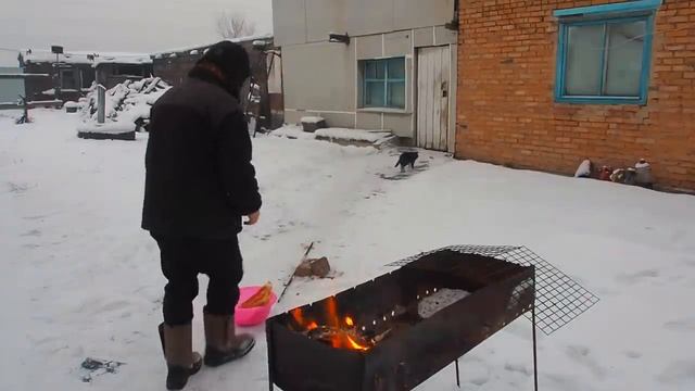 Деревенская семья завтракает правильным питанием и диетическая утка на мангале в морозную погоду