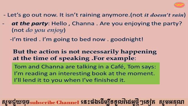 Lesson 24 Present Continuous Tense 2|This channel is teaching English Grammar and Explain in Khmer Language . To help the Students to know how to use English Grammar . Basic English Grammar in Khmer ,Learning English in Khmer . ----------------------------------------------------------------------------------------------------------- You can find our videos on social media: https://web.facebook.com/Rathanakkon168/ https://twitter.com/chantha85319243 https://www.instagram.com/monicachan4995/ -------------------------------------------------------------------------------------------------------- Lesson1 verb to be – simple present of verb to be https://youtu.be/UZTQwTt7cmo Lesson2 verb to have simple present https://youtu.be/F94-nrdt-mM Lesson 3 verb can in simple present tense https://youtu.be/XpkwDwdXdyg lesson4 Personal pronouns https://youtu.be/2bLjzTCltRw Lesson5 Verb have got in simple present tense https://youtu.be/ZmuFDK0OBag Lesson6 Simple Present tense https://youtu.be/lNzHGV0tE7k Lesson7 Present continuous tense https://youtu.be/Ajtk7a3Za0Y Lesson 8 Simple future tense https://youtu.be/HKTNzWx9YGs Lesson 9 Simple Future Tense 2 https://youtu.be/1ICbBnb3XpY Lesson10 possessive forms1 https://youtu.be/WupVesjAuQM Lesson11 Possessive Forms 2 https://youtu.be/yGA32dD5ZFg Lesson 12 There is , there are https://youtu.be/Gjg1vY6Xwbk Lesson 13 Demonstrative pronouns https://youtu.be/77CpPdbmVfY Lesson 14 Demonstrative Adjective https://youtu.be/ofn7boqFw8w Lesson 15 Noun: gender https://youtu.be/Z_k_XW5yJCc Lesson 16 adjectives and adverbs https://youtu.be/Xr2bduDMDto Lesson 17 The simple past tense of verb to be https://youtu.be/JUtcvfPtzdY | Lesson 18 The Simple past tense of verb to have and can https://youtu.be/5wNbpJCqYbg | Lesson 19 Some , any https://youtu.be/_Ih0Wtw6Kjw| Lesson 20 Countable nouns and uncountable nouns https://youtu.be/3tO65TKcKCw Lesson 21 Simple Past Tense https://youtu.be/21Yg-Vs2Dkk | Lesson 22 Past Tense of Regular verbs and Irregular verbs https://youtu.be/ZwjQ9CyDCbo | Lesson 23 Present Continuous Tense 1 https://youtu.be/E1odniSUduM | BasicII