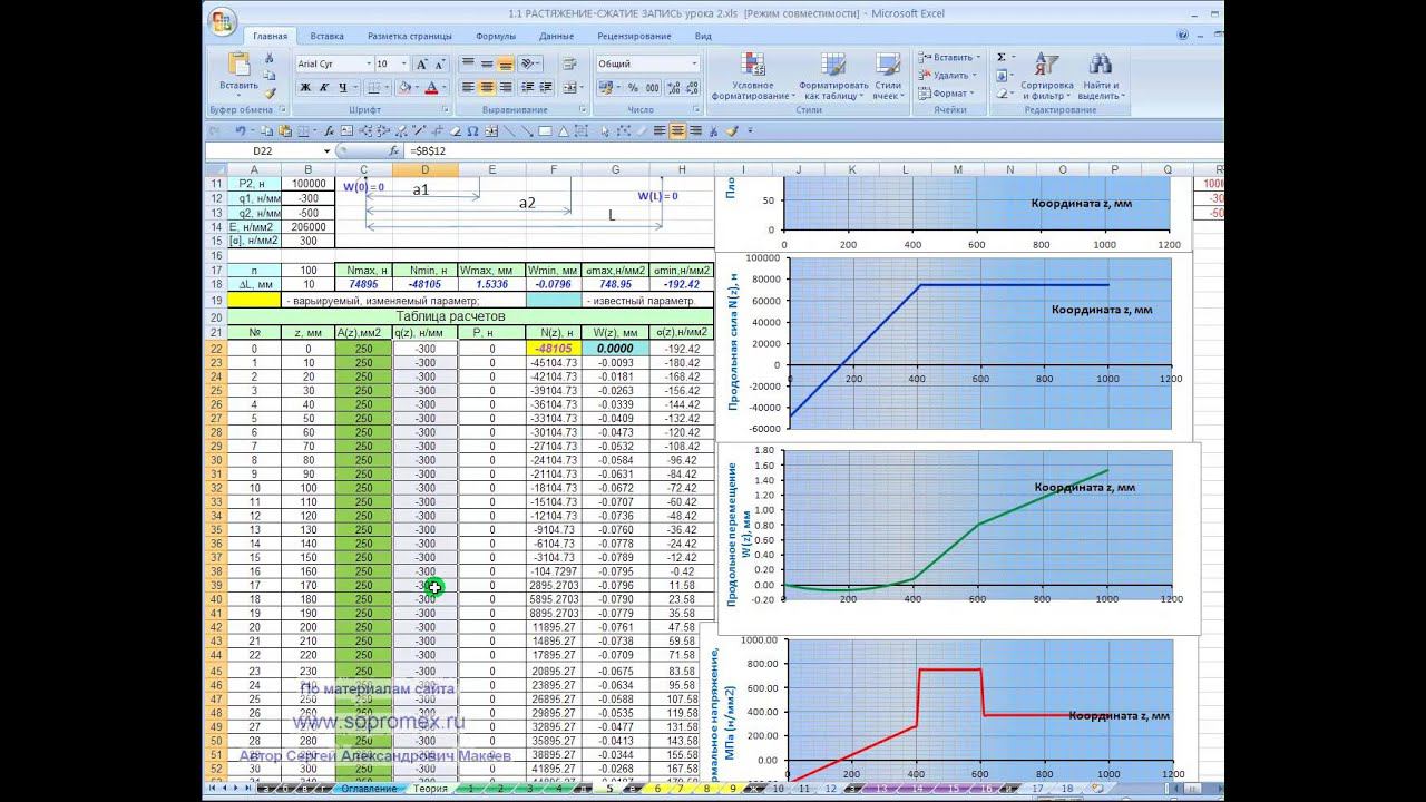 https://sopromex.ru/ - официальный сайт онлайн университета проф. Макеева С.А. Хотите избавиться от фобии сопромата? Хотите наконец-то разбираться в нем и быть как рыба в воде? Уметь определять реакции опор, строить самостоятельно эпюры внутренних сил, подбирать сечения элементов из условий прочности и жесткости... Тогда подписывайтесь на мою авторскую рассылку бесплатных обучающих материалов: http://m1.sopromex.ru/ Посмотрите обязательно отзывы... Так понятно еще вам нигде не объясняли все эти сложные понятия сопромата! Получить сам автоматизированный Excel-шаблон "Растяжение-сжатие стержней" со всеми 18 задачами (шаблонами) можно на сайте ps1besplatno.mcdir.ru. В видео уроке 2 дано пошаговое пояснение полного цикла решения задач на растяжение-сжатие на примере ступенчатого стержня, загруженного постоянными нагрузками. http://www.youtube.com/watch?v=g1IEVLXMwGI