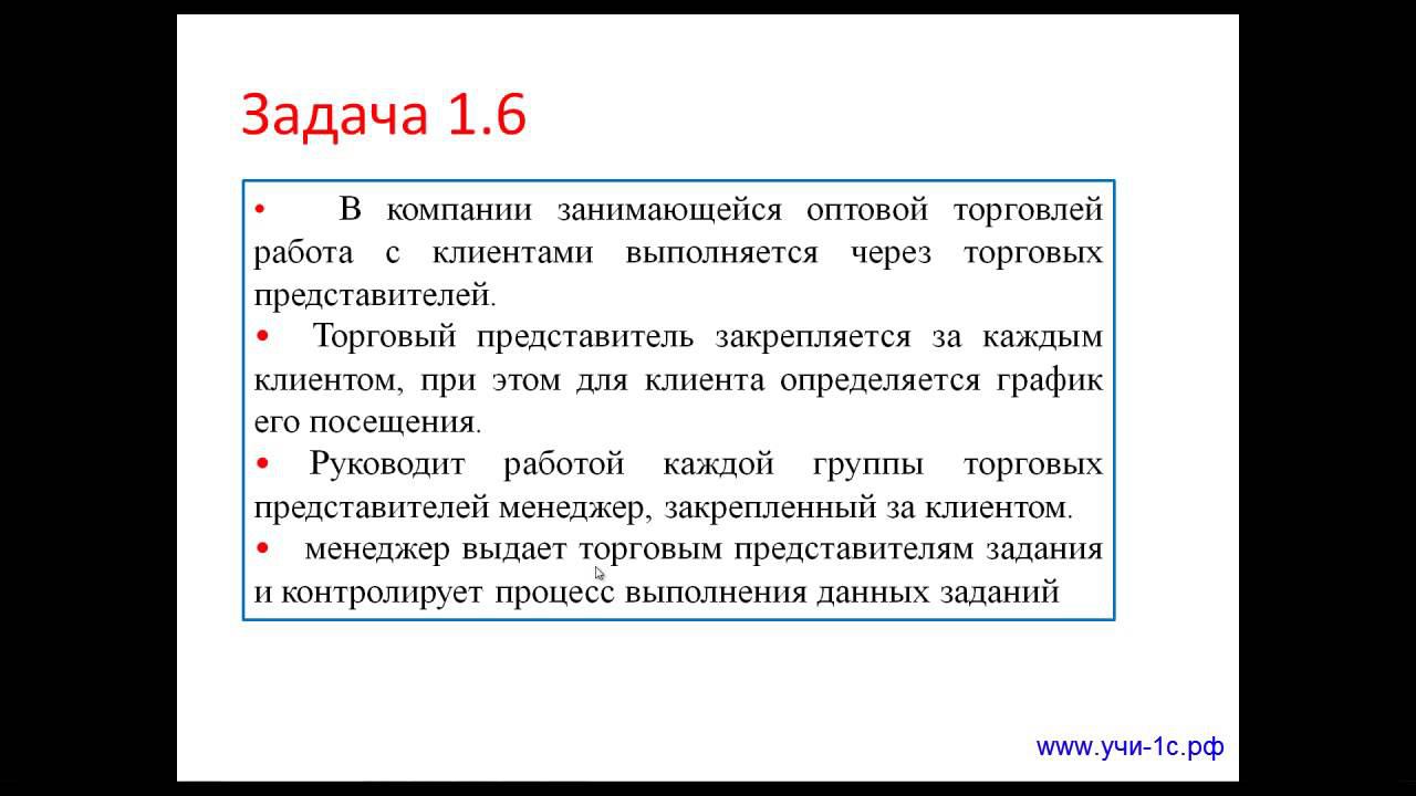 Много видео уроков по 1с на сайте http://xn---1-vlc2bgy.xn--p1ai http://youtu.be/4hiFS5kMi1s Самоучитель 1с предприятие. Решение задачи 1с специалист консультант по УТ 11. Задача 1.6 • В компании занимающейся оптовой торговлей работа с клиентами выполняется через торговых представителей. • Торговый представитель закрепляется за каждым клиентом, при этом для клиента определяется график его посещения. • Руководит работой каждой группы торговых представителей менеджер, закрепленный за клиентом. • менеджер выдает торговым представителям задания и контролирует процесс выполнения данных заданий Если вам понравилось это видео, подпишитесь на наш канал по 1с, кнопка под видео "подписаться".