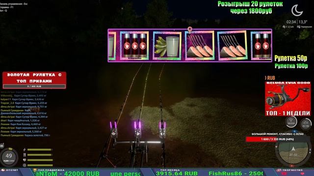 Поддержка донатом https://new.donatepay.ru/@1032463 Альтернативный донат https://www.donationalerts.com/r/kalyamba11 5536913964533059 карта Тинькоф Если стрим лагает,смотри стрим на трово https://trovo.live/s/Kalyamba_na_Ribalke Мой ВК - https://vk.com/kalyantv НИК в игре kalyan11 НАШ ДИСКОРД СЕРВЕР https://discord.gg/3ZeEDGs5h6 Заказ водоема на 1 час - 500р ( весь стрим 2500р ) Модерка на канале 1300р ( каждая следующая на 100р больше) ✅Призы в рулетке "ЗОЛОТАЯ" 500р ✔ ЗОЛОТО ✔ ПРЕМ ✔ КАТУШКИ РАПТОР 40, ВЕНГИ, ТАЙГА, СИЛЬВЕР 80, И другие ✔ ПАЛКИ ПИЛКЕРНАЯ, ДОНКА МОРСКИЕ, ✔ РОД ПОД, СТУЛЬЯ ✅Призы в рулетке СТАНДАРТ : 100р ✔ катушкИ РАПТОР 40, ВЕНГИ, ТАЙГА, СИЛЬВЕР 80, И другие ✔ катушки 60 для медного ( ЭВИИ, НАТОРЫ, ГОЛДА, и тд) ✔ ПИЛКЕРНОЕ УДИЛИЩЕ КОРОЛЕВА ОКЕАНА ✔ Морское Донное удилище ✔ прем ( 3, 7, 30 дней) ✔ золото ( 1, 3, 5, 10, 20 ,50) ✔ билет на море ( 1, 3, 5 дней) ✔ голд наживка и др. ✅Призы в рулетке "СТАРТОВАЯ" 50р ✔ катушка Венга ✔ катушка "silver80" ✔ катушка "БЕЛЫЙ КАЛИБР" ✔ катушка "Черный калибр" ✔ катушка "Протон" ✔ катушка "Нарга 6000" ✔ Набор Фидерист и спинингист ✔ Карповик Фортуна ✔ фидерные удилища ✔ прем, золото, алкашка, наживки и тд P.s Рулетка это не казино, а награда за поддержку стримера. Вечный ТОП ПОДДЕРЖКИ (10.06.2025) 1. Леха сварной 214 572 2. Dimon_pokemonchik 127 034 3. Skreb79 103 061 4. Interceptor 96 230 5. FishRus86 82 500