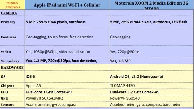 Apple iPad mini Wi-Fi + Cellular VS Motorola XOOM 2 Media Edition 3G, main differences, specs : iPad mini Wi-Fi + Cellular to XOOM 2 Media Edition 3G MZ608, Quick Full Specs Comparison of their: Dual-core, 1 GHz Cortex-A9, 768 x 1024 pixels, 7.9 inches, Dual-core, 1.2 GHz Cortex-A9, 800 x 1280 pixels, 8.2 inches, CPU, Resolution, Data, Storage, Network, Camera and such...