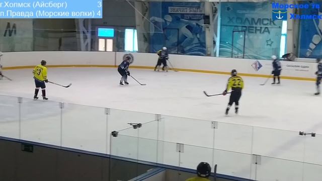 видео снято 27 марта 2022 года в ледовом комплексе Холмск-Арена. В синей форме команда посёлка Правда (Морские волки), а в жёлтой форме команда города Холмск (Айсберг). Встреча завершилась со счётом 6-5 в пользу посёлка Правда (Морские волки)