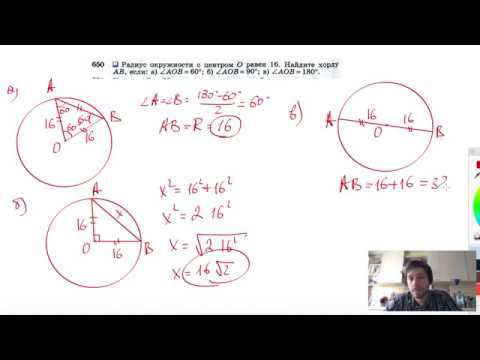 №650. Радиус окружности с центром О равен 16. Найдите хорду АВ, если: a) ∠AOB = 60°; б) ∠AOB = 90°; в) ∠AOB=180°. Поддержать канал рублём - 5469400944002125 (Сбербанк) Мой второй канал для подготовки к ЕГЭ и ОГЭ - https://www.youtube.com/ЕвгенийСумин Инстаграм - https://www.instagram.com/EGE_OGE.math Личный инстаграм - https://www.instagram.com/ee_sumin VK - https://vk.com/evgeniysumin FB - https://www.facebook.com/EvgeniySumin