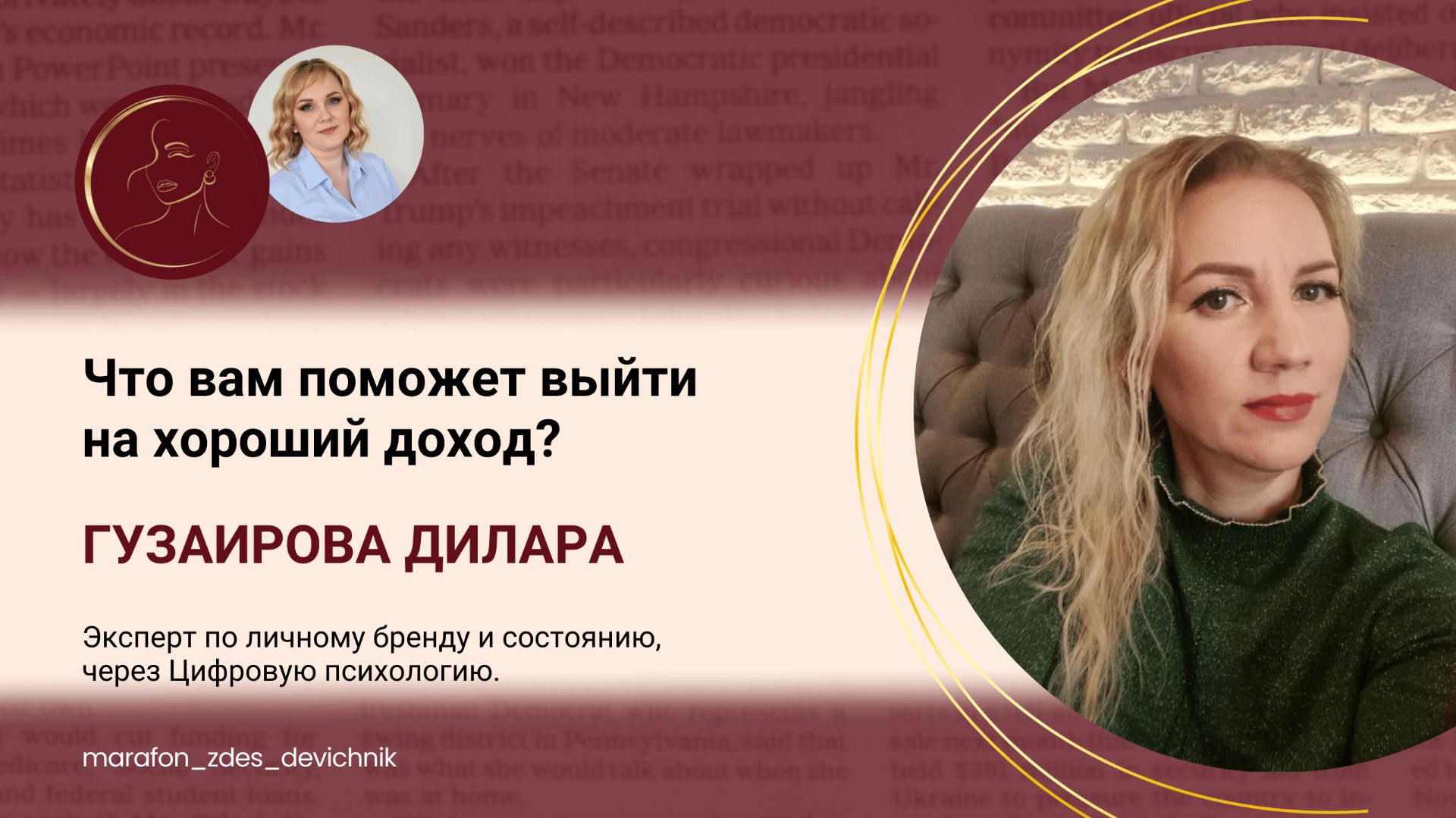 Запись эфира от Гузаировой Дилары, эксперта по личному бренду и состоянию, через Цифровую психологию. «Что вам поможет выйти на хороший доход? Разберем вашу дату рождения». На эфире мы разобрали, как понять свои сильные стороны и получить возможность увеличить доход. Профессии по дате рождения. Канал в телеграм Гузаировой Дилары https://t.me/DilaraGuzairova_dg Канал марафона ЖЕНСКИЙ КЛУБ https://t.me/marafon_zdes_devichnik Организатор марафона ЖЕНСКИЙ КЛУБ https://t.me/permyakova_smm #коуч #психолог #семья #годсемьи #мужижена #отношения #консультация #мужчина #женщина #сексолог #нумеролог #хроникиакаши #нумерология #чтоговорятцифры #женскаяэнергия #ресурс #любовь #отношения #любовныеотношения #счастливывместе #имысчастливы #самооценка #любовьксебе #успех #жизнь #финансы #деньги #доход #расстановки #нутрициолог #зож #похуде #яхудею #старение #молодость
