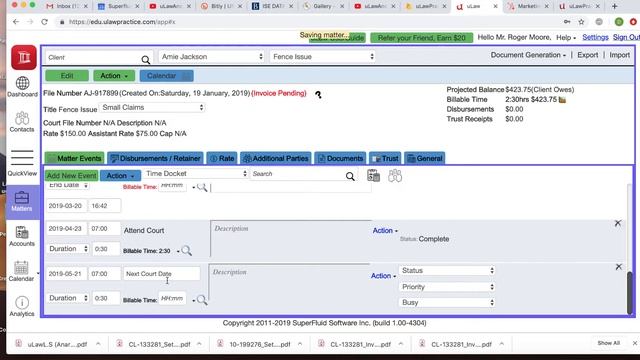 This video explains how to enter and set up reminders for future court dates using the action dropdown in the matter.