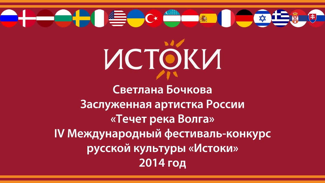 Светлана Бочкова. Заслуженная артистка России «Течет река Волга» Фестиваль-конкурс русской культуры «Истоки» ставит своей задачей показать многообразие и красоту русской культуры, которая на протяжении многих веков формировалась за счет традиций многонациональности и добрососедства. Фестиваль-конкурс русской культуры «Истоки» - многоплановое мероприятие, которое объединяет конкурс вокалистов, обширную экскурсионную и культурную программу, концертные выступления, гала-концерт и награждение участников фестиваля-конкурса. Мы расширяем русскоязычное пространство. Благодаря поддержке Россотрудничества в фестивале принимают участие дети-соотечественники, проживающие за рубежом. Сайт: www.festistoki.ru E-mail: festistoki@mail.ru